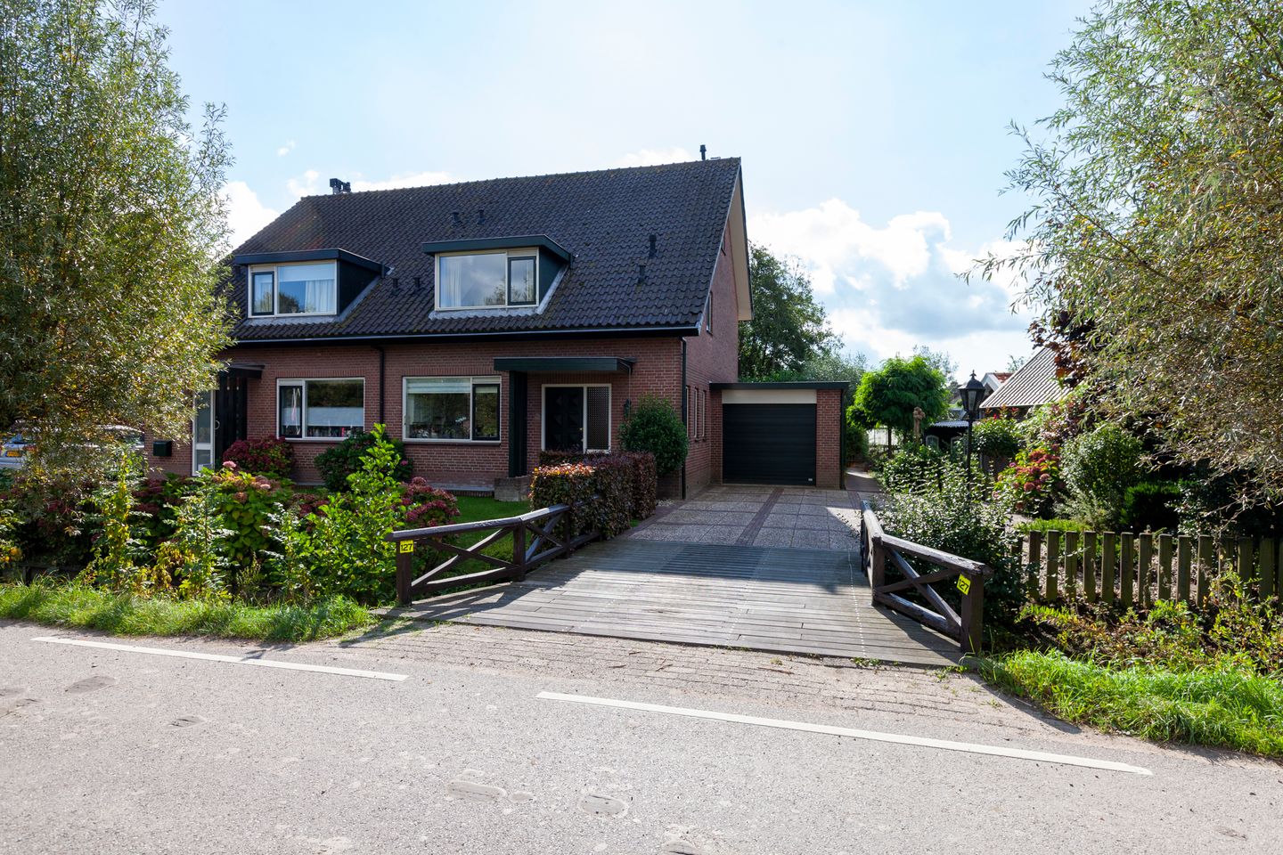 De brug over het water gaat naar de brede oprit voor de garage met parkeergelegenheid voor twee tot vier auto's. De groen aangelegde voortuin leidt je naar de voordeur met een stoep en overkapping. De lichte hal is praktisch ingedeeld met een garderobe, de meterkast, toiletruimte, de open trap naar de verdieping en een deur naar de woonkamer en keuken. De L-vormige woonkamer heeft een schuifpui naar de achtertuin, een open haard en een deur naar het souterrain en de bijkeuken. Aan de voorzijde is ruimte voor de eethoek en is de lichte keuken opgesteld met diverse inbouwapparatuur. Vanuit de keuken is er weids uitzicht over de omgeving. De bijkeuken is voorzien van de opstelplaats van de wasmachine/droger en heeft een deur naar de garage en de tuin. De aangebouwde garage heeft een elektrische roldeur.