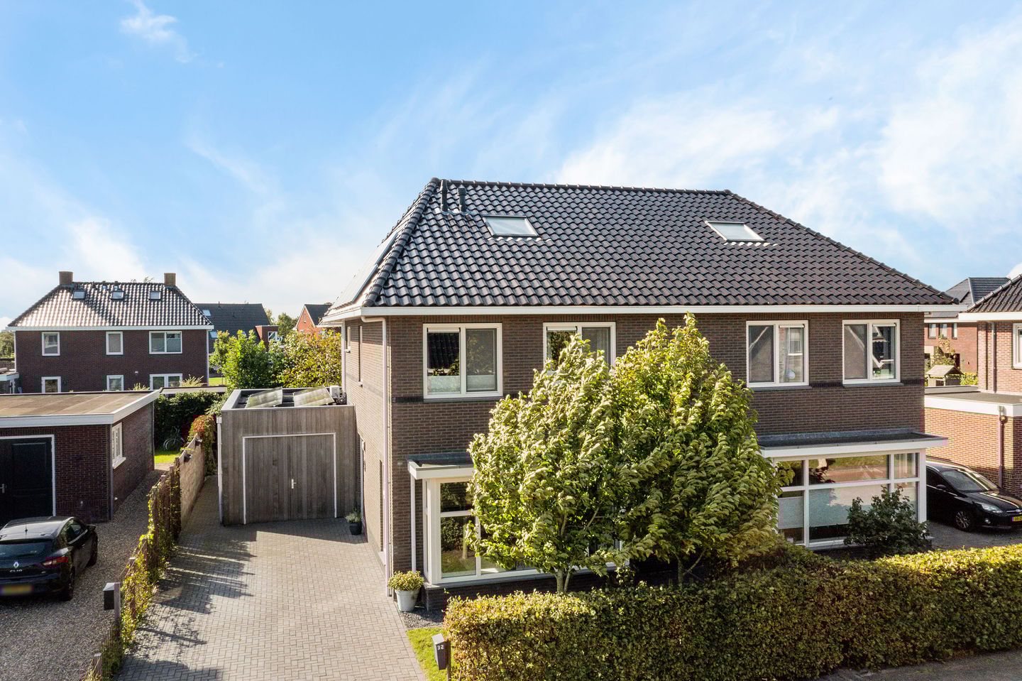 De woning is gebouwd met oog voor detail: een strakke bakstenen gevel met lichte accenten, een fraai schilddak met donkere dakpannen en een charmante erker aan de voorzijde die zorgt voor extra lichtinval in de woonkamer. Aan de zijkant bevindt zich de garage (met achterom), bereikbaar via de brede oprit die voldoende parkeergelegenheid op eigen terrein biedt. De woning is zeer onderhoudsvriendelijk dankzij het gebruik van duurzame materialen. Zo zijn de ramen, kozijnen en deuren uitgevoerd in kunststof. Ook de dakgoot en dakkapel zijn uitgevoerd in kunststof.