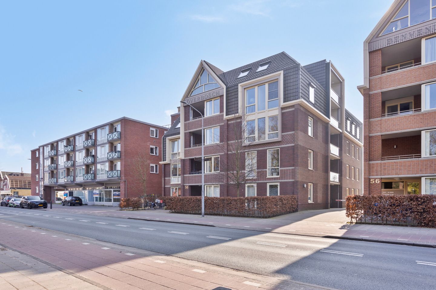 De voorgevel van gebouw Overbosch heeft een geweldige uitstraling, met details in het metselwerk en speelse daklijnen. Kom je met de auto of fiets thuis, dan rij je naar het parkeerterrein en de bergingen aan de achterzijde. Hier is een entree, die toegang biedt tot de gezamenlijke hal. Aan de voorzijde is de hoofdentree, met de brievenbussen en de intercom. Met de trap of lift ga je naar de derde verdieping, waar dit appartement gesitueerd is.