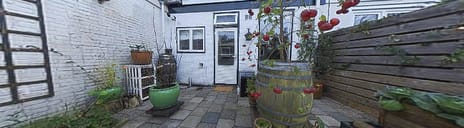 De achtertuin heeft een plantenborder en is verder bestraat, wat de mogelijkheid biedt om naar eigen idee verder te vergroenen. Je kunt tegels verwijderen of, zoals nu, ook kiezen voor planten in bakken en potten. De tuin heeft, net als de berging, een afsluitbare poort naar de