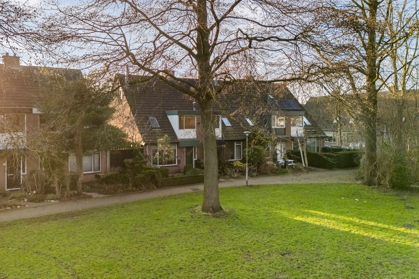 Vanuit de keuken kom je in de zonnige tuin, die veel privacy biedt. De achtergevel van de keuken is voorzien van screens, zodat je in de zomer kunt genieten van schaduw. De tuin heeft een fijne mix van tegels en borders met planten, waardoor het een groene en rustige uitstraling heeft. Via een aparte deur in de tuin bereik je de berging, die ook binnendoor bereikbaar is via de keuken. Achterin de tuin bevindt zich een schuur over de volledige breedte, wat ideaal is voor extra opbergruimte.