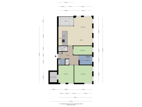 - 8 m² (3,49 meter diep en 2,20 meter breed)