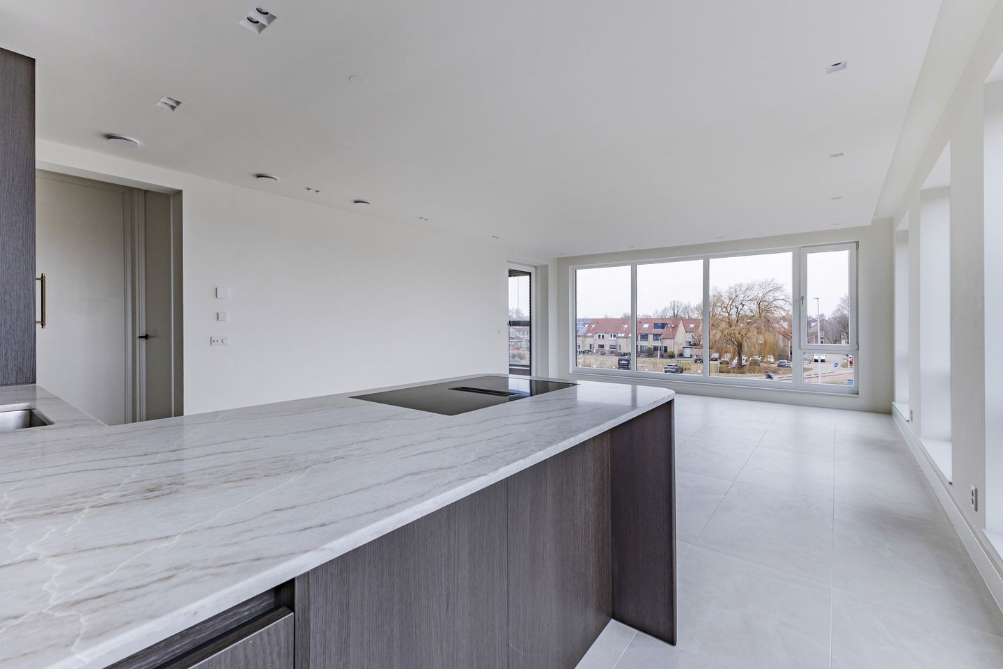 En dan de living met open keuken, wauw! Omdat dit appartement gelegen is op de hoek zijn er veel raampartijen die zorgen voor veel natuurlijk daglicht. De keuken is hip, trendy en helemaal van deze tijd, Voorzien van luxe inbouwapparatuur zoals, Quooker, kookplaat met ingebouwde afzuiging, vaatwasser koel en vrieskast. De fraaie ronding maakt deze keuken uniek. Dit is de plek om lekker aan de bar gezamenlijk te koken onder het genot van een drankje en fijne gesprekken met je vrienden. Vanuit de woonkamer heb je aan beide kanten een fraai weids uitzicht!