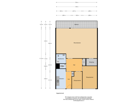 De centraal gelegen hal verbindt alle vertrekken van het appartement. Aan de achterzijde bevindt zich de royale woonkamer van circa 40 m², voorzien van grote raampartijen en een deur naar het balkon op het oosten. De woonkamer is desgewenst eenvoudig op te splitsen, waardoor een extra slaapkamer gerealiseerd kan worden.