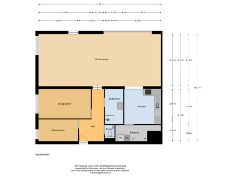 Appartement: Met de lift bereiken we de vijfde verdieping. De ruime entree hal geeft toegang tot de voordeur van de woning. Vanuit de garderobe ruimte geeft het halletje toegang naar alle vertrekken.