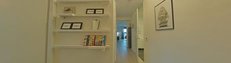 We beginnen met een iets kleinere slaapkamer aan de linkerkant en aan de rechterkant het toilet. Het toilet heeft een hangcloset en een design fonteintje. Geen zorgen voor het lichtknopje s avonds want de verlichting gaat automatisch aan en uit.