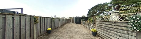 At the rear, the house offers a sunny, fully paved garden of approximately 102 m² facing southwest, ideal for those who enjoy a low-maintenance outdoor space with plenty of sun and privacy. Behind the fence runs a path with a small ditch and allotments beyond that, making the back garden peaceful.
