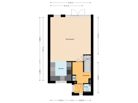 Via de voortuin op het noordwesten bereik je de voordeur van deze fraaie woning. Achter de voordeur bevindt zich de entreehal, die toegang biedt tot de meterkast, een toiletruimte met zwevend toilet en wastafel, de trapopgang naar de eerste verdieping en de woonkamer.