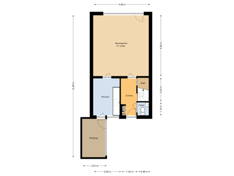 Entree: hal, trapopgang, toilet, toegang tot de woonkamer met open keuken en toegang tot de achtertuin. De woning heeft aan de voorzijde een aanpandige berging welke vanuit de keuken bereikbaar is.