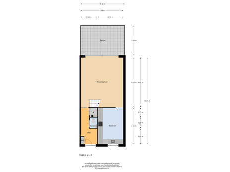 De gehele begane grond is voorzien van een betegelde vloer die drempelloos doorloopt. In het keukengedeelte ligt bovendien tapijt. De muren en plafonds zijn strak afgewerkt. In de woonkamer bevindt zich de trap naar de eerste verdieping.