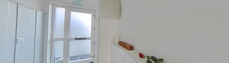 Entrance with meter cupboard, coat space, and access to a neatly tiled floating toilet with a small washbasin.