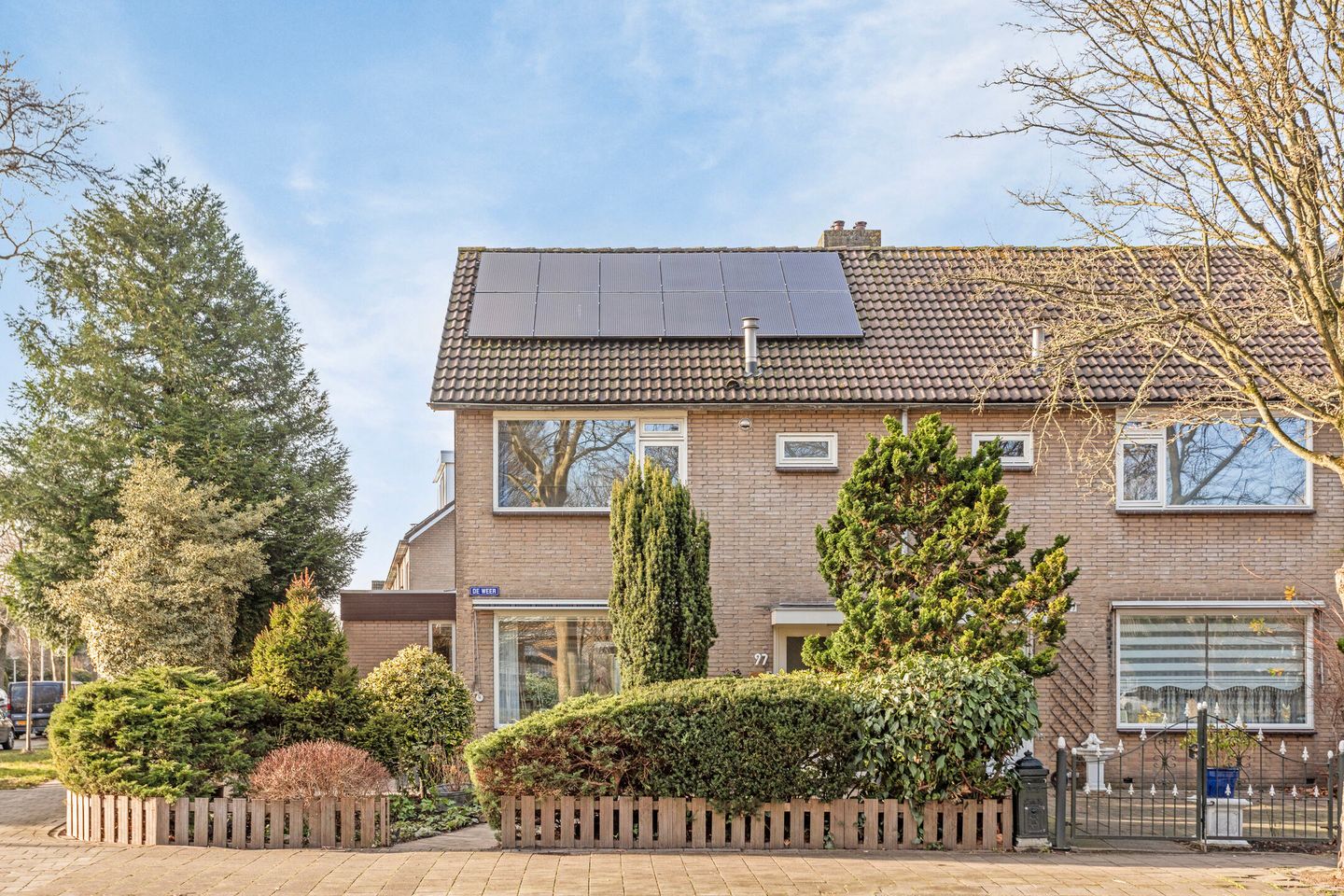 Met een voortuin op het oosten, een zijtuin op het zuiden en een achtertuin op het westen vind je hier altijd een plekje in de zon. Hoge, deels groenblijvende beplanting zorgt voor een tuin met een mooie uitstraling en privacy. De brede achtertuin is grotendeels bestraat, waardoor er genoeg plek is voor een dubbele tuinset. Naast de berging is een poort naar de steeg en de zijtuin zorgen voor een tweede achterom.