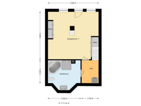 In het souterrain van deze woning vind je de eerste slaapkamer, een badkamer en een ruime hal met daarin de wasmachine- en drogeraansluitingen. De eerste slaapkamer is royaal van formaat en voorzien van een tegelvloer. De kamer is uitgerust met meerdere grote kasten. Dankzij de grote ramen is de lichtinval hier uitstekend. Via deze slaapkamer heb je toegang tot de achtertuin.