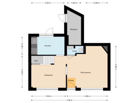 - 15 m² (4,30 meter diep en 3,49 meter breed)