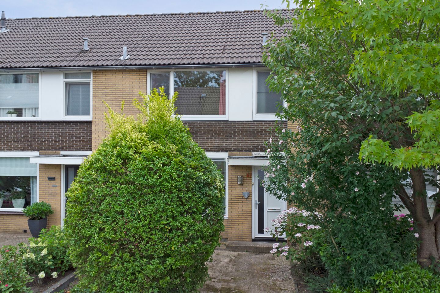Zowel de voor- als achtertuin is voor een groot deel bestraat en er is veel groen, die deels groenblijvend is. De hoge beplanting in de voortuin zorgt voor privacy in de woonkamer, en de achtertuin op het zuiden is perfect voor de zonliefhebber. Als je naar de buren kijkt, dan is een uitbouw mogelijk waarna er nog genoeg tuin is. In de stenen berging is ruimte voor de fietsen, en er is een poort naar de steeg.