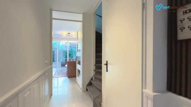 Via de betegelde voortuin bereik je de (fietsen)berging en voordeur van deze charmante woning. Na binnenkomst word je verwelkomd door een ruime entreehal, die toegang biedt tot de meterkast, een mooie toiletruimte met zwevend toilet en fonteintje, de trap naar boven en de woonkamer.