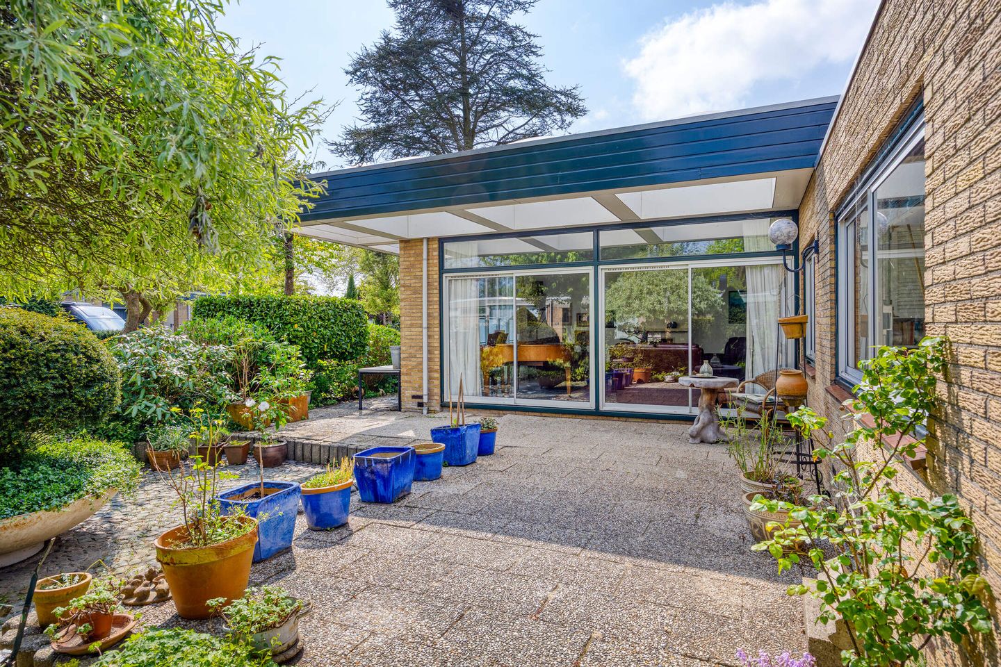 Centraal in de woning ligt een heerlijke patio van circa 35 m². Dankzij de beschutte ligging geniet je hier al vroeg in het voorjaar en tot laat in het najaar van de zon, uit de wind en in alle rust. Alle woonvertrekken rondom deze patio zijn via schuifpuien verbonden met deze buitenruimte, waardoor binnen en buiten prachtig in elkaar overlopen. De badkamer is uitgevoerd in fraai marmer en voorzien van een dubbele wastafel, tweede toilet, inloopdouche én een ligbad. De ruime ouderslaapkamer heeft directe toegang tot de badkamer, voor extra comfort. De voormalige garage (3,62 x 9,91 m) is binnendoor toegankelijk. De garagedeur is vervangen door een kozijn met loopdeur, waardoor de ruimte nu perfect dienst kan doen als hobby-/slaapkamer of kantoor. Aangrenzend bevindt zich de technische ruimte met aansluitingen voor wasmachine, droger en de cv-installaties.