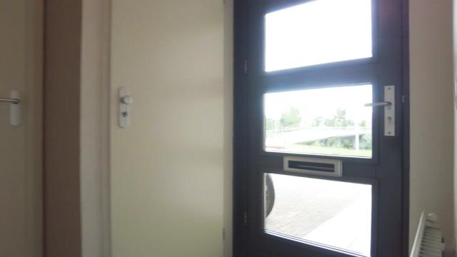 Je komt binnen in een lichte hal met een zwart-wit geblokte tegelvloer, garderoberuimte en meterkast. Vanuit hier zijn het toilet, de berging en de woonkamer bereikbaar.