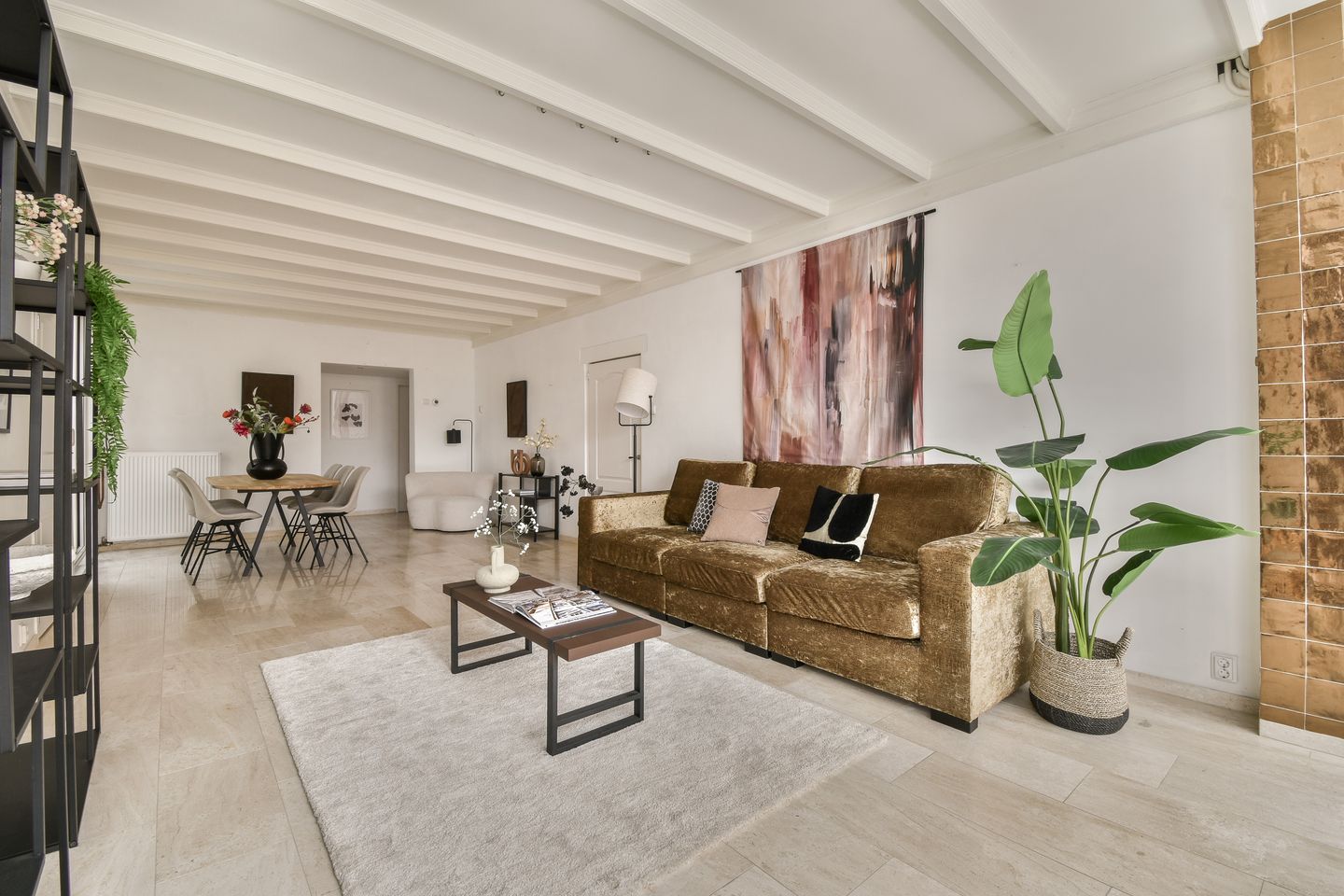 Via het trapje bereikt u de ruime woonkamer, eveneens met een prachtige marmeren vloer, een fraai balkenplafond en hoge raampartijen. Aan de achterzijde van de living vindt u een sfeervolle patio die d.m.v. een schuifdeur te bereiken is. Via de roestvrijstalen spiltrap bereikt u het fijne dakterras; een heerlijke ruimte met volop zon én privacy!
