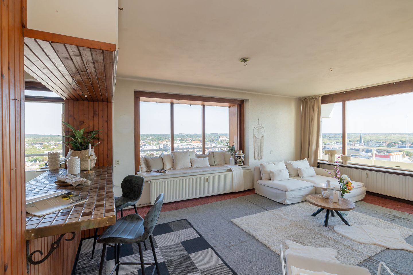 De zijramen met window-seat in de woonkamer geven een fabelachtig weids uitzicht over het dorp en de achterliggende duinen. Het is iedere ochtend opnieuw een belevenis om naar de zonsopkomst te kijken.