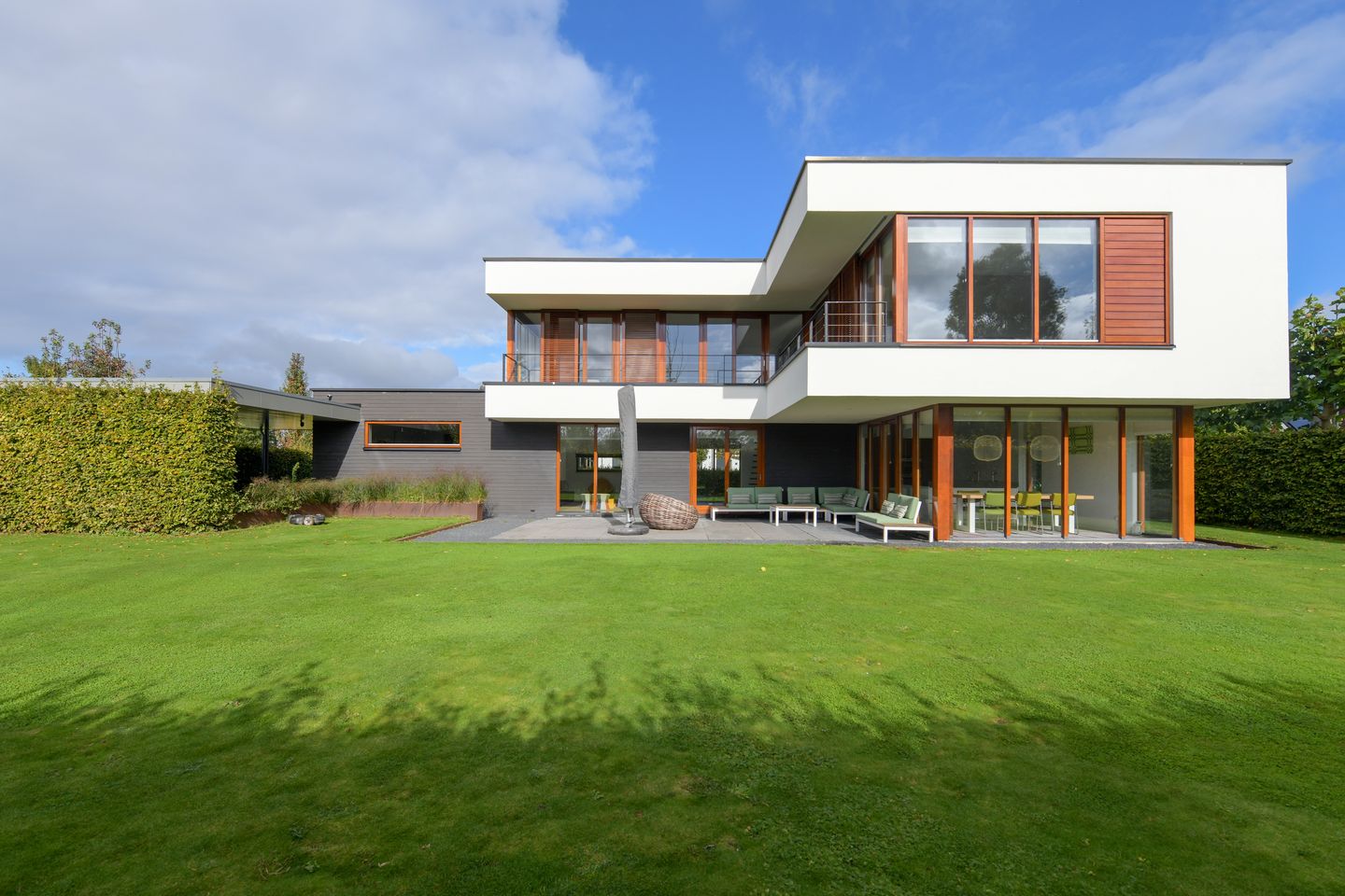 • Langs de gehele gevel op de eerste verdieping bevindt zich het balkon. Van binnenuit vergroot dit optisch de ruimte, van buiten geeft het een fraaie overstek en een prachtige uitstraling.
