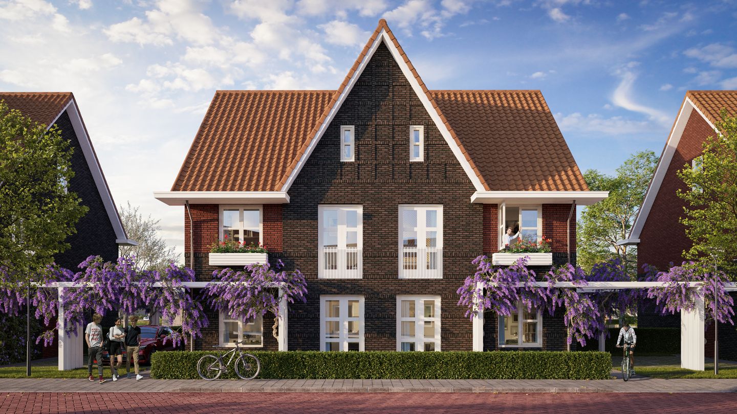 Deze royale twee-onder-één-kapwoning heeft een evenwichtige uitstraling. De gevels van de linker- en de rechterwoning zijn synchroon uitgevoerd en delen een tuitgevel. De charme van een jaren 30 bouwstijl in combinatie met wooncomfort dat helemaal van deze tijd is. De achtertuin grenst direct aan het water. Optioneel kun je een aanlegplaats creëren voor een boot. De auto parkeer op je eigen oprit. BOUWNUMMERS 38 EN 39 • Standaard ingedeeld met 3 slaapkamers • Fraaie ligging aan het water waar een eigen optionele aanlegplaats voor een boot gecreëerd kan worden • Karakteristieke jaren 30 architectuur met ruime dak overstekken, een tuigevel, variatie in metsel-werkverbanden en geïntegreerde bloembakken • Parkeren op je eigen oprit