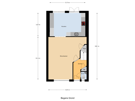 - 56 m² (11,00 meter diep en 5,11 meter breed)