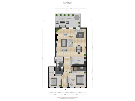 Binnenkomst in de ruime hal met toegang tot het gastentoilet en praktische waskamer. Het royale 3-kamerappartement omvat circa 155 m² woonoppervlak gelegen op de eerste verdieping. De royale living van circa 93 m² is licht en biedt meerdere indelingsmogelijkheden. De dubbele deuren vanuit de woonkamer leiden naar een fraaie daktuin/terras van circa 28,5 m², waar je geniet van een sfeervol en groen uitzicht en optimale privacy.