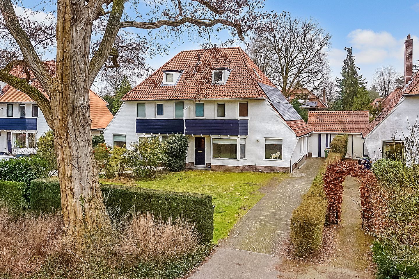 Royale twee-onder-één-kap-woning met een stenen garage en een oprit gesitueerd in de groene en zeer geliefde wijk Hoge Dennen te Zeist.