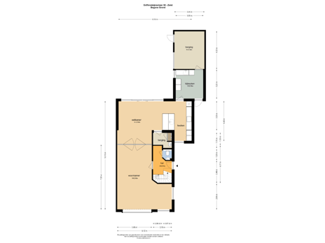 Entree aan de zijkant van het woonhuis. Hal, toilet en toegang tot de royale, uitgebouwde woonkamer. De gehele begane grond is voorzien van een betonvloer met vloerverwarming en een fraaie pvc-visgraatvloer. Aan de voorzijde is er vrij uitzicht op een groenstrook aan de overzijde. Door de uitbouw aan zowel de achtergevel als de zijgevel is er een royale woonkeuken ontstaan, welke is af te sluiten met een aluminium pui. De fraaie keuken is luxe uitgevoerd met diverse inbouwapparatuur en een gezellige bar waar u heerlijk kunt zitten. Door een prachtige hoge glazen schuifpui vormen de woonkamer en keuken een fraaie eenheid. In de keuken bevindt zich een eerste bijkeuken, waar tevens de opstelplaats voor de C.V.-ketel is. Daarnaast is aan de achterzijde de voormalige garage omgebouwd tot een tweede royale bijkeuken; hier is ook de opstelplaats voor de was- en drooginstallatie.
