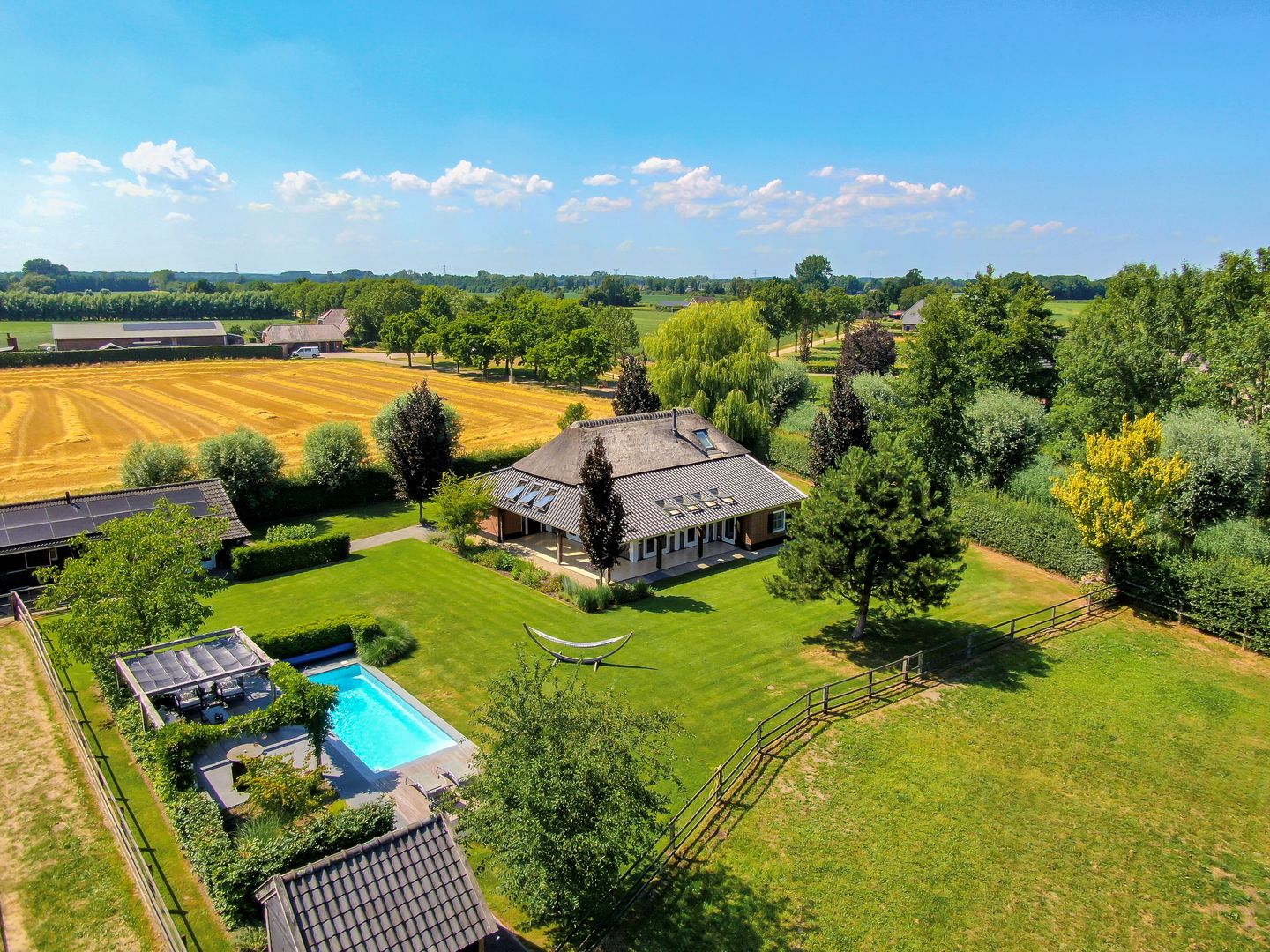 Het geluid van hoefslag in de rijbak, het geruis van bladeren in de wind en de geur van pas gemaaid gras. Welkom op een plek waar al uw woondromen waar worden gemaakt en waar het elke dag voelt als vakantie. Deze woonboerderij uit 2011, gelegen op bijna 9.000 m² eigen grond, laat zien hoe modern comfort en authentiek buitenleven hand in hand kunnen gaan. De echte paarden- en buitenliefhebber vindt hier alles wat het hart begeert: professionele stallen, een rijbak, ruime weilanden en een gastenverblijf voor wie ook wil delen in dit buitenleven. Het deels rietgedekte dak en de houten balken vertellen een verhaal van ambacht en kwaliteit, terwijl de moderne voorzieningen zorgen voor hedendaags comfort. Dit noemen we pas ruimte voor het leven.
