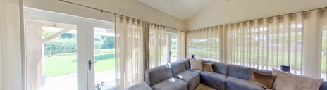 En dan bereiken we de tuin waar wellicht de moeilijkste keuze van de dag wacht: waar kijkt u het eerst naar? Het uitnodigende verwarmde zwembad, de eindeloze ruimte van de weilanden, of misschien toch die perfecte loungeruimte? Het grote overdekte terras is uitgevoerd met dezelfde keramische tegels als binnen, waardoor binnen en buiten prachtig in elkaar overlopen. Deze plek is niet alleen handig tijdens een onverwachte bui, maar vooral heerlijk voor die momenten waarop u juist de schaduw opzoekt terwijl u toch optimaal van de buitenlucht kunt genieten.
