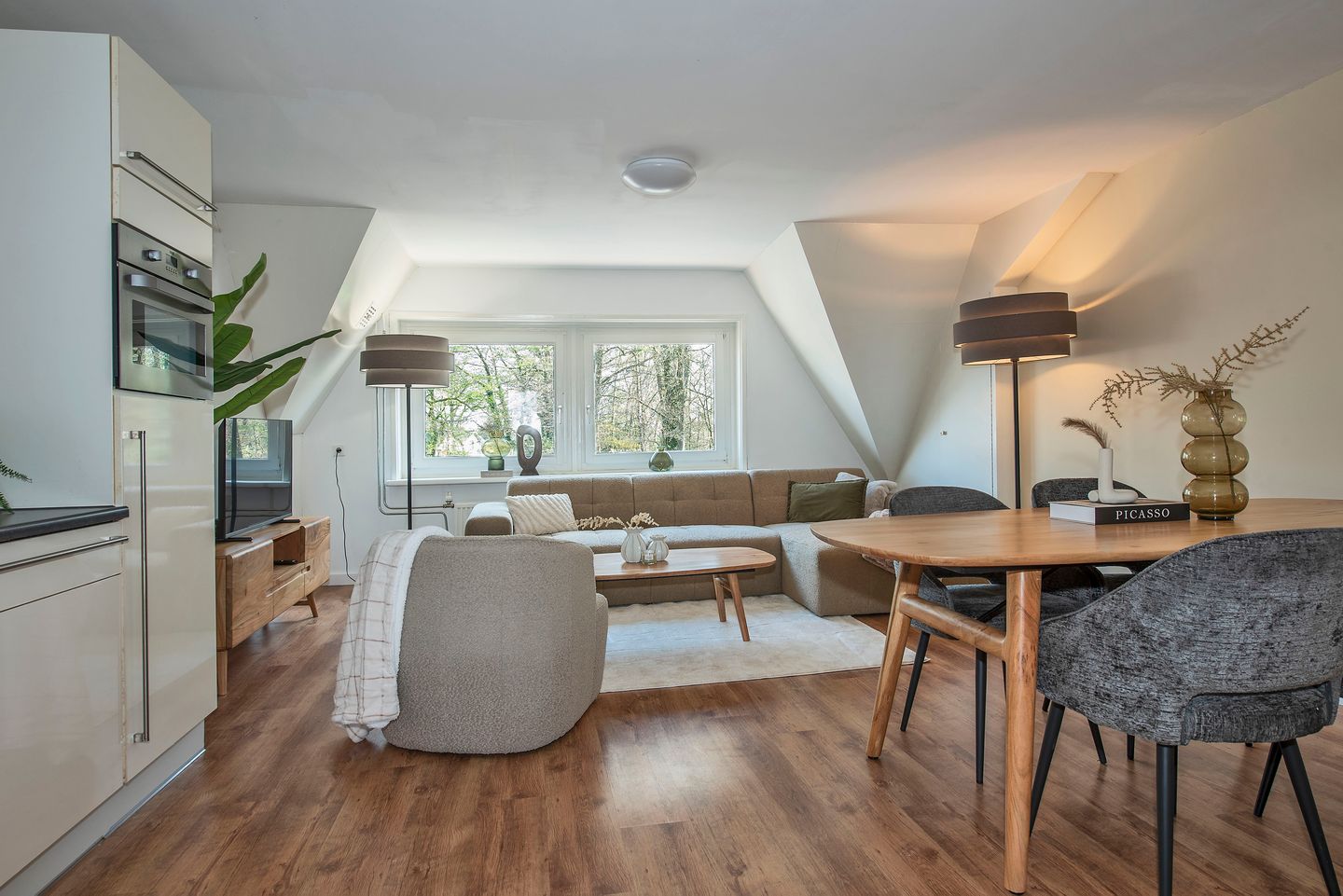 Appartement: opgang middels trap, dakterras, entree, hal, toilet met fontein, meterkast, sfeervolle woonkamer met open keuken voorzien van inbouwapparatuur, portaal, ruime slaapkamer met vaste kasten, badkamer met douche, waskom en opstelplaats voor de wasapparatuur, slaapkamer met vaste kasten.