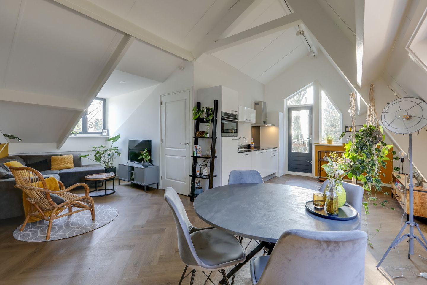Entree appartement, woonkamer voorzien van keurige PVC vloer (2021), nette en strakke plafond en wandafwerking, de indeling is gemakkelijk naar wens aan te passen. Nu is het zitgedeelte bij de dakkapel en het eetgedeelte bij het dakraam. Maar dat kan eenvoudig en naar wens aangepast worden.