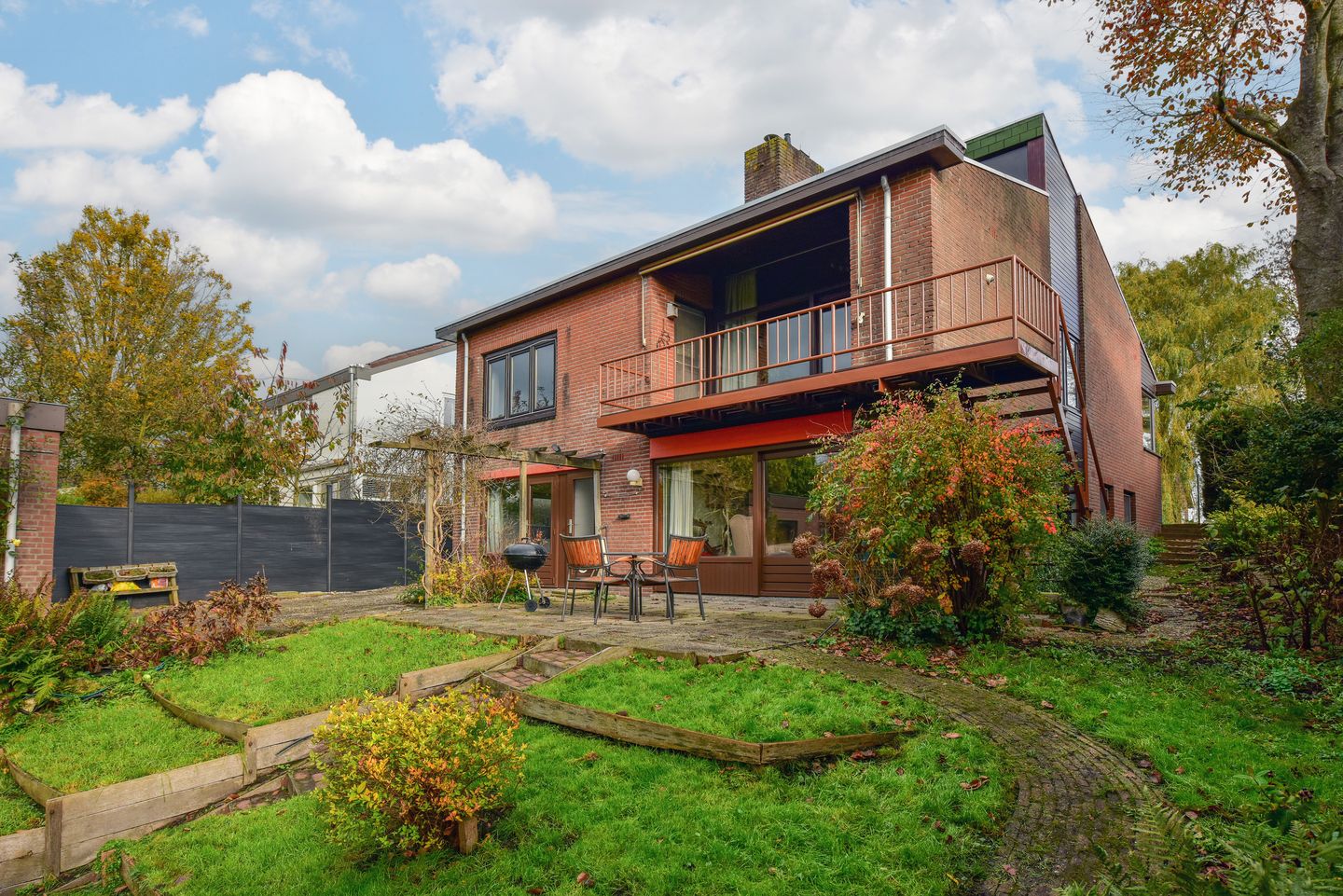 There is access to the backyard from both sides of the house. At the rear, the garden borders a small canal, and because of the dike location, the garden gently slopes down. To the left of the house, a staircase leads to the recently renovated balcony.