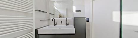 - Dubbele wastafel, inloopdouche, en toilet