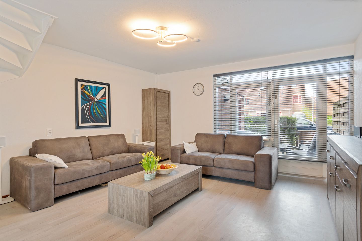 De woonkamer is heerlijk licht dankzij de grote raampartijen aan de achterzijde. De ruimte is strak afgewerkt en biedt volop mogelijkheden om een gezellige zithoek en eethoek te creëren. Vanuit de woonkamer heb je direct toegang tot de tuin, wat zorgt voor een fijne verbinding tussen binnen en buiten.