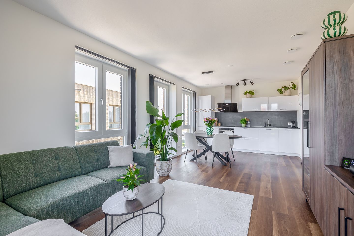 Doordat het appartement op de vierde en bovenste verdieping ligt, heb je geen bovenburen én een heerlijke rustige ligging. Dankzij de hoekpositie stroomt het daglicht van meerdere kanten naar binnen. De ruime woonkamer voelt hierdoor extra licht en ruimtelijk aan. De moderne open keuken is strak afgewerkt met witte fronten, een donker werkblad en alle benodigde inbouwapparatuur. Denk aan een inductiekookplaat, oven, vaatwasser en koel-/vriescombinatie. De ruimte leent zich perfect voor een grote eettafel waar je met gemak gasten ontvangt. Ook aan de afwerking is gedacht: een doorgelegde vloer, strakke wanden en overal vloerverwarming en -koeling maken het comfort compleet.