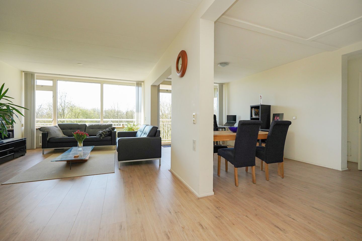 De grote woonkamer met een vaste kast voor extra bergruimte, biedt veel ruimte en licht doordat deze is doorgebroken naar de naastgelegen eet/slaap/studeerkamer en de centrale hal, hierdoor is een woonkamer ontstaan van in totaal ca. 49 m²! Van hieruit kun je genieten van de middagzon op het lange, zonnige zitbalkon van ca. 9 m² (west).