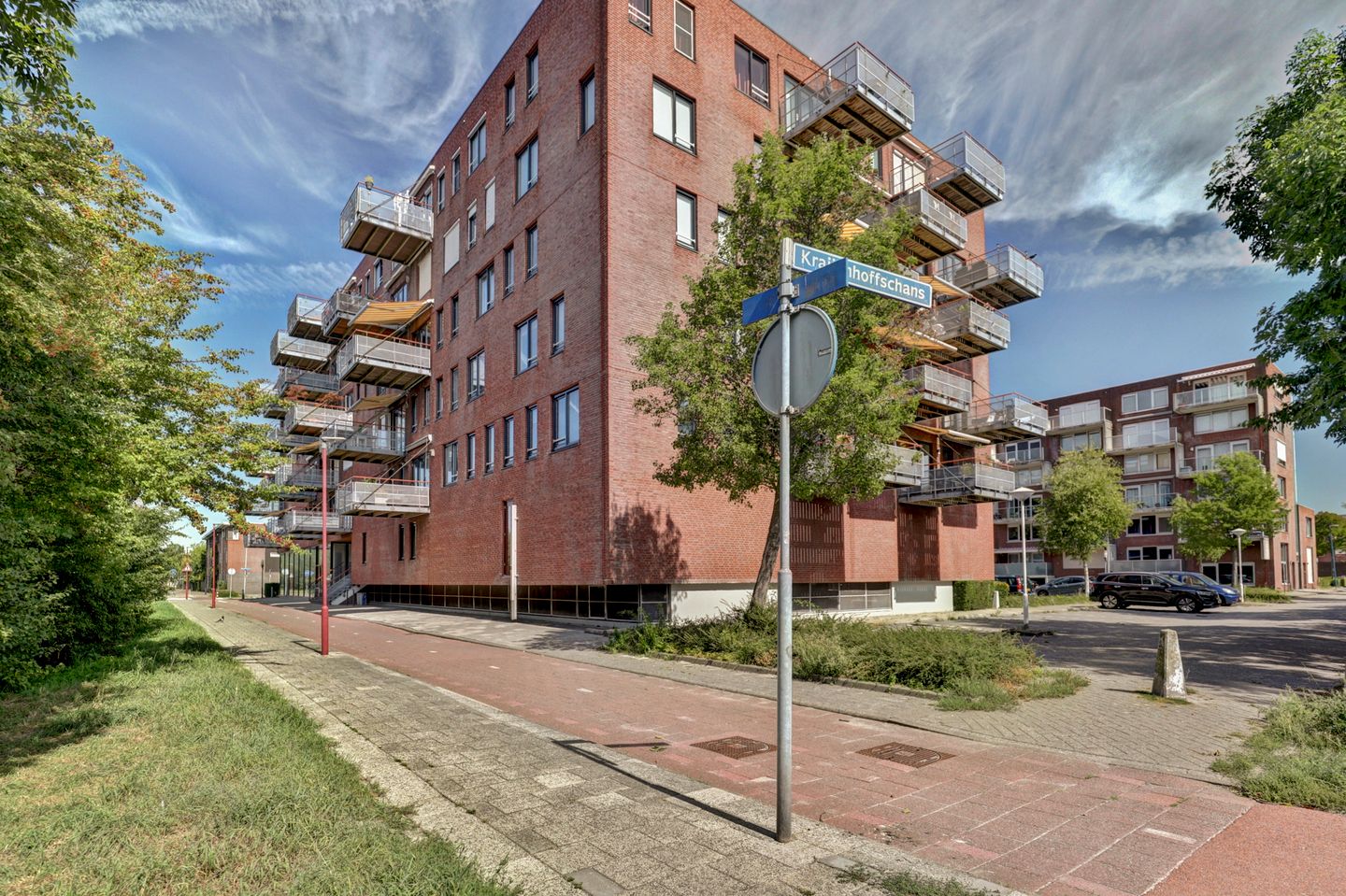 Via de openslaande deuren in de woonkamer is er toegang tot het balkon met houten vlonders. Het balkon is gelegen op het zuidwesten en biedt een fraai uitzicht over het groen en water aan de Linieschans.