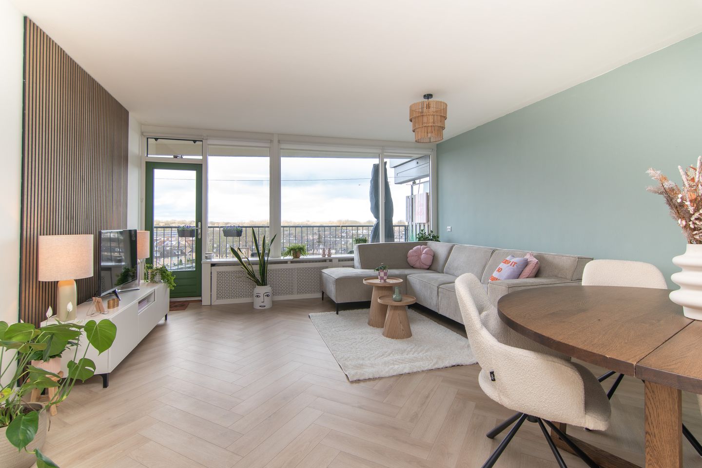 Op de 7e verdieping van een goed onderhouden appartementencomplex, op korte afstand van het overdekte wijkwinkelcentrum en Randstad Railstations gelegen, ruim 4-kamer appartement met lichte woonkamer van ca. 26m², dichte keuken met luxe hoekopstelling (2024) voorzien van inbouwapparatuur, badkamer met douchehoek, separate en luxe toiletruimte, 3 prima slaapkamers van ca. 13, 12 en 6m², eigen (fietsen)berging op de begane grond en woningbreed balkon van ca. 11m² op het zuidwesten.