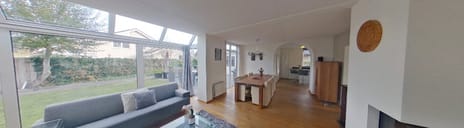 Toegang naar een grote living met een massief houten vloer en sfeervolle design haard, alsmede een fraaie serre, waardoor er een plezierige lichtinval is en u een leuk uitzicht heeft op de eigen tuin.