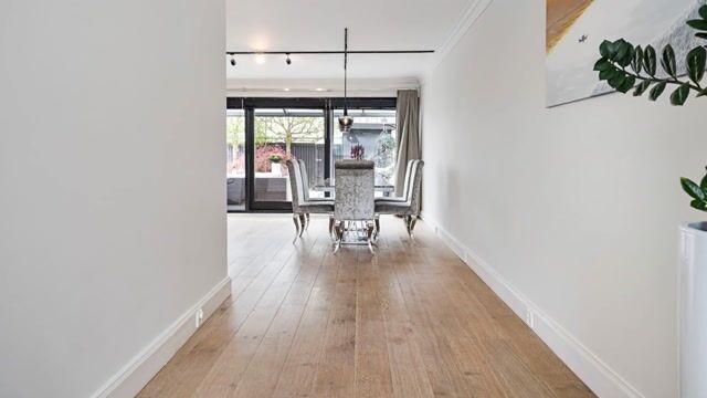 De royale woonkamer van maar liefst 7,82 meter breed is heerlijk licht dankzij de grote raampartijen aan de achterzijde. De ruimte is voorzien van een sfeervolle haard, een fraaie vloerafwerking en biedt via de schuifpui toegang tot de ruime achtertuin.