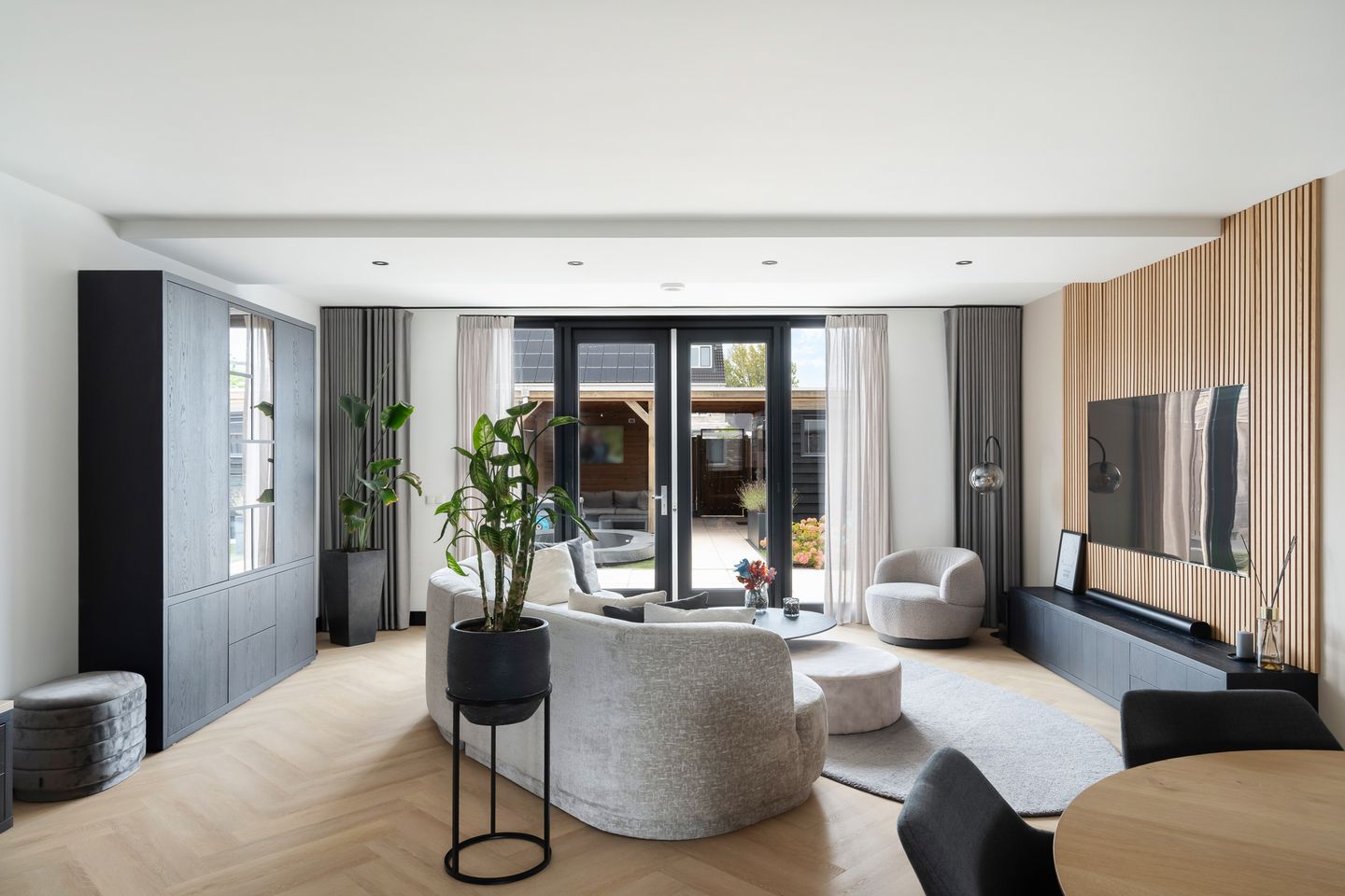 De woning ligt aan een rustig en kindvriendelijk voetpad. Je komt binnen in de hal met meterkast (met 13 groepen, aardlekschakelaar en 3 fase aansluiting) en modern toilet (met hangend toilet en fonteintje). De ruime woonkamer is tuingericht en aan de achterzijde uitgebouwd. De inrichting straalt luxe en comfort uit, met glad gestucte wanden, een visgraat PVC-vloer en modern houten wandpaneel met cinewall. De half open keuken aan de voorzijde is in 2023 grotendeels vernieuwd en voorzien van een composieten aanrechtblad en nieuwe fronten. Ook de wasbak, kranen en inductiekookplaat zijn toen vernieuwd. Verder zijn er een koelkast, vriezer, afzuigkap, oven en magnetron ingebouwd. De keuken heeft een bar, waar het gezellig aanschuiven is als er gekookt wordt.