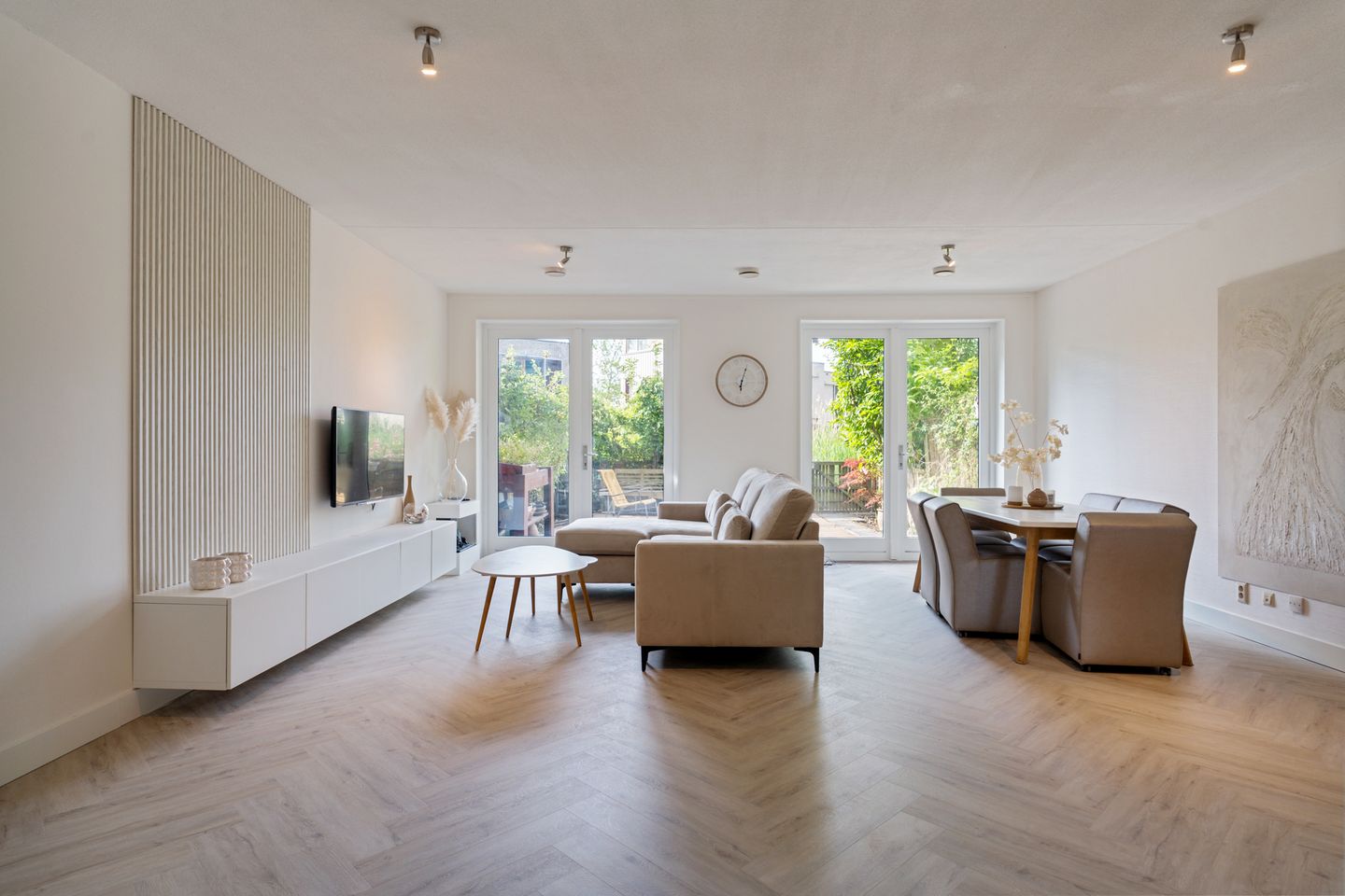De woonkamer is licht en ruim, met een directe verbinding naar de achtertuin. Grote ramen zorgen voor veel daglicht en een prachtig uitzicht op het water en de achterliggende groenstrook. Op de vloer ligt vloerverwarming, net als in de rest van de woning.