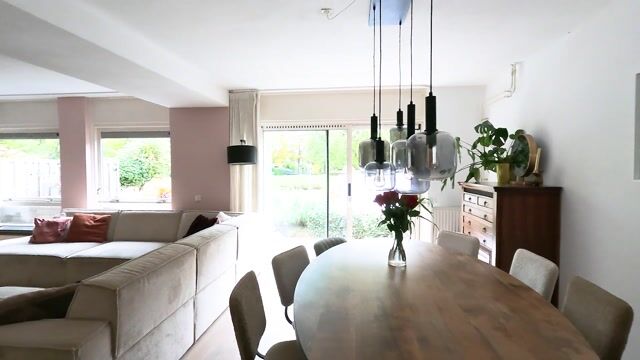 Binnen kom je in de hal met de meterkast, een modern toilet met hangend closet en fonteintje. Hier tegenover vind je een praktische trapkast. Zodra je de woonkamer instapt, voel je het meteen: licht, lucht en ruimte. De open verbinding met de keuken maakt het geheel ruimtelijk en uitnodigend, perfect voor een gezellig groot gezin, etentjes of lange avonden met vrienden.