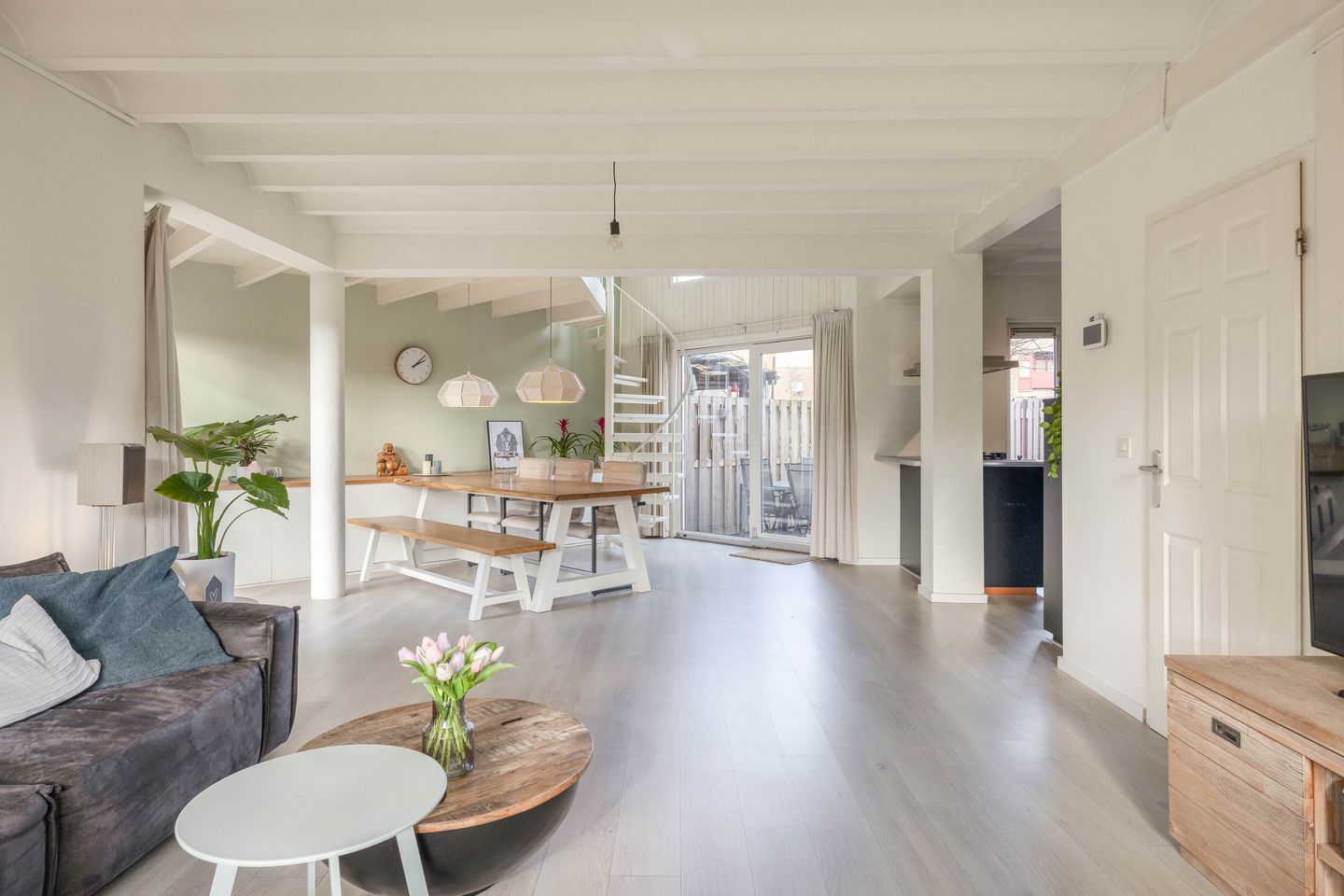 Bij binnenkomst treft u een hal met plavuizen vloer en toegang tot de lichte woonkamer met laminaatvloer. De woonkamer heeft een speelse indeling en biedt via een wenteltrap toegang tot een handige werkplek of speelhoek. De moderne keuken is gewrapt en voorzien van diverse inbouwapparatuur, waaronder een 5-pits gasfornuis, combi-oven/magnetron, vaatwasser, koel-/vriescombinatie en een close-in boiler voor snel warm water.