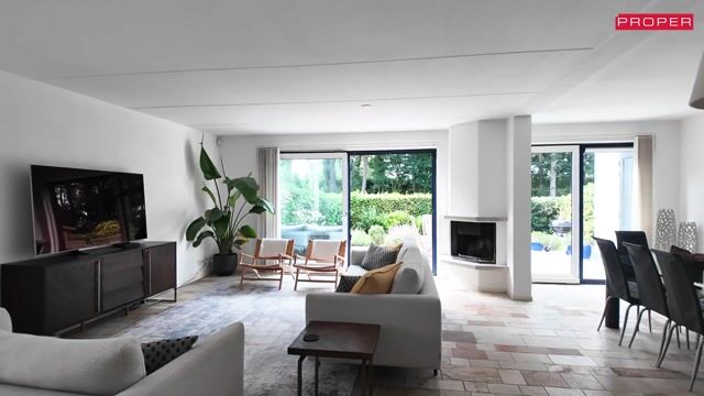 Spacious and very bright living room with pleasant light from the side window and the windows in the sliding doors. The beautifully landscaped backyard faces southwest and has a park-like character with various terraces where you can always find a sunny spot or shade. The garden-oriented living room has a fireplace in the perfect location. The living room provides access to the kitchen with a luxurious SieMatic built-in kitchen (2010) with appliances and natural stone countertops.