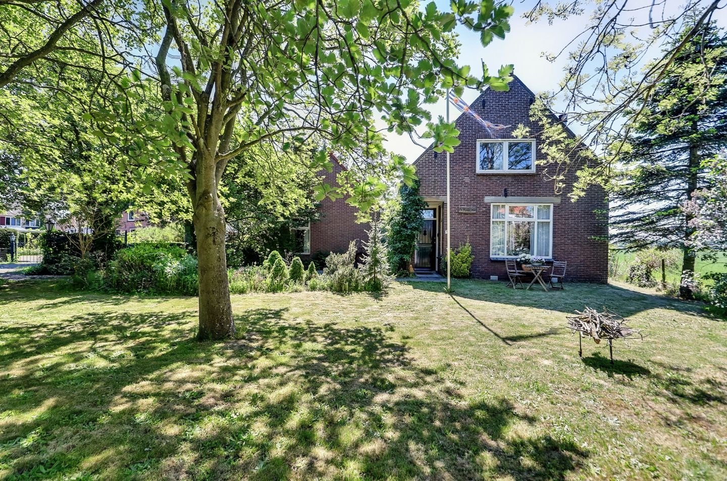De tuin rondom de woning is een oase van rust en privacy. Aan de voorzijde bevindt zich een groot gazon met volwassen bomen en diverse borders, waar u in alle seizoenen kunt genieten van het groen. Aan de achterzijde van de woning ligt een royaal terras op het zuidoosten, ideaal voor een ochtendkoffie of zomerse barbecue. Dankzij het ruime perceel zijn er volop mogelijkheden voor tuinliefhebbers, speelruimte voor kinderen of het houden van kleine dieren. De tuin grenst aan een slootje en biedt vrij uitzicht over de omliggende weilanden.