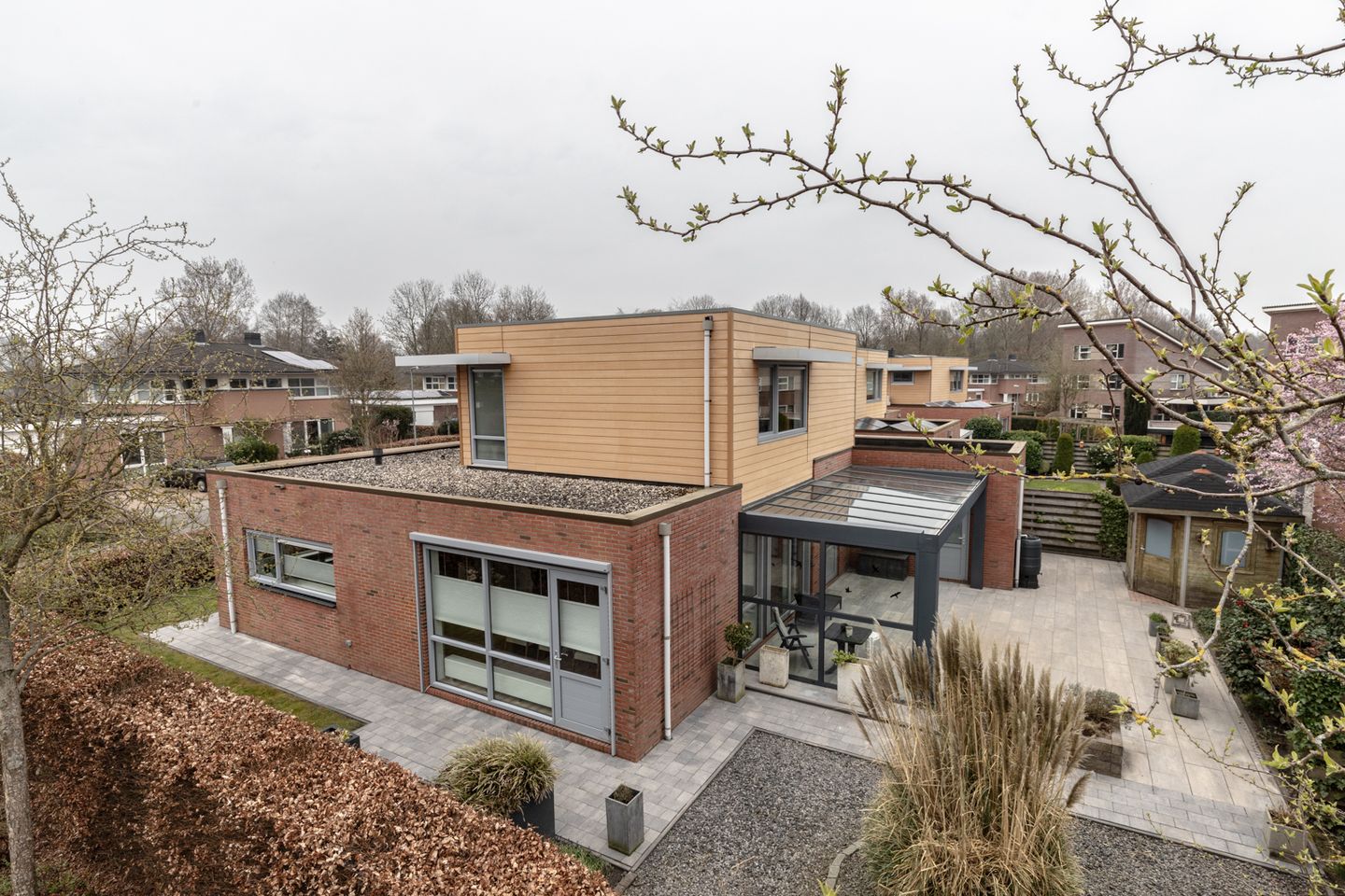 De FRAAIE SERRE-ACHTIGE OVERKAPPING (2021) is grotendeels van glas en heeft ook nog geïntegreerde zonwering, die je niet alleen beschermd tijdens de heetste dagen van het jaar, maar je ook alvast lekker buiten laat zitten in het voor- & najaar.